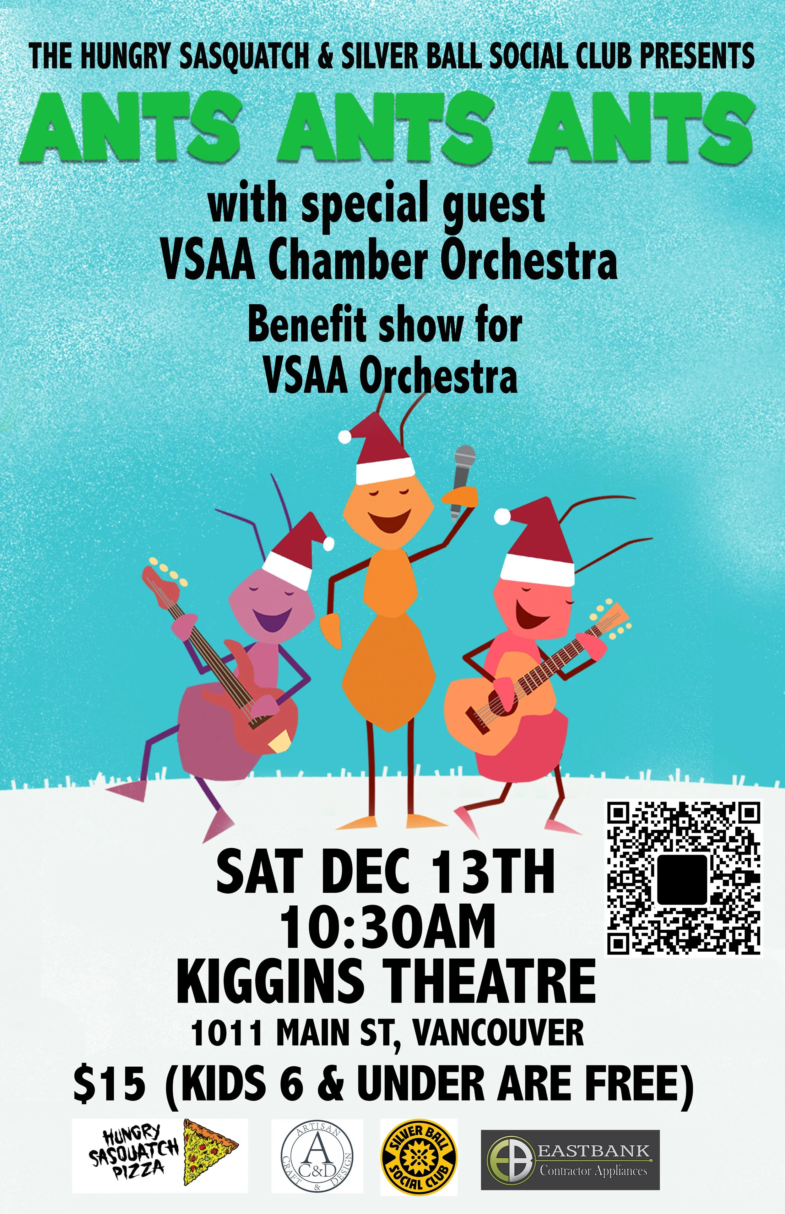 A huge thank you to Ants Ants Ants, our event sponsors (The Hungry Sasquatch, Silver Ball Social Club, Eastbank Contractor Appliances, Artisan Craft & Design), and The Kiggins for making it possible for VSAA Orchestra to receive 100% of the proceeds from this event.